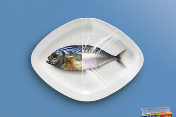 保鮮膜的創(chuàng)意廣告:用過我們的保鮮膜后,魚還是跟活魚一樣的新鮮哦,而沒有用過我們的保鮮膜的魚都已經(jīng)脫水了。(這對(duì)比真的是好強(qiáng)烈呀?。?/span>