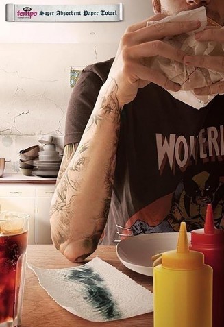 餐巾紙的創(chuàng)意廣告:我家的餐巾紙去污效果可是杠杠的,好到連你身上的紋身都能直接擦掉。(雖然JIOJIO覺得這廣告有點(diǎn)夸大的成分,但是這創(chuàng)意還是棒棒的呢,這設(shè)計(jì)師估計(jì)是紋身后悔了吧,嘻嘻)
