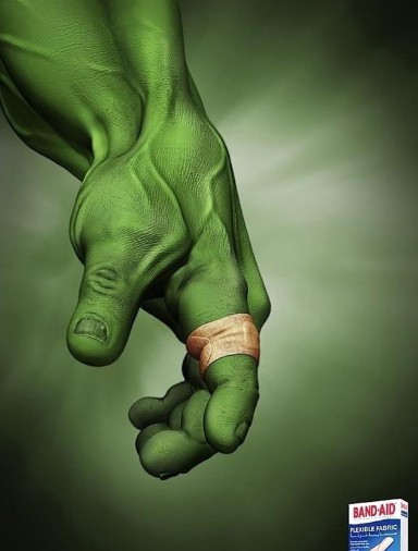 創(chuàng)可貼的創(chuàng)意廣告:多大的傷口我們都能搞定!當(dāng)然也包括是綠巨人手上的傷口了?。▌?chuàng)意太強(qiáng)大了,連綠巨人的傷口都能包扎,我們的小傷口還不是小意思呀。)