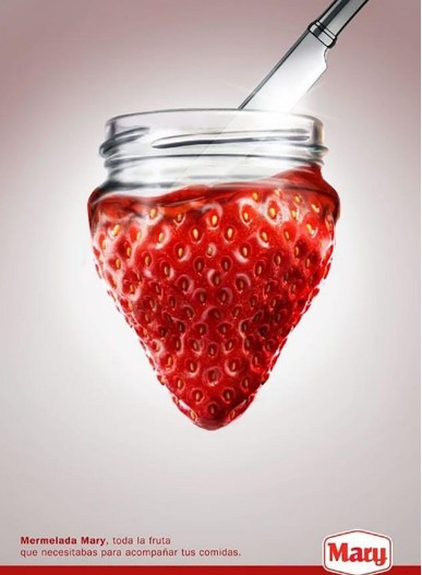 草莓醬的創(chuàng)意廣告:我們草莓醬的新鮮程度可以媲美剛采摘的草莓,不但新鮮而且果肉多!